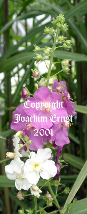 Königskerze, Wollblume, Fackelblume Imposante zwei- bis mehrjährige Pflanzen mit interessanten Blütenkerzen Standort: voll sonnig; sandig-magerer Boden Diese zweijährige bis staudige, 60-100 cm hohe Königskerze blüht von Mai - Juli in kräftigem Violett. Ihre Blätter bilden eine dem Boden nach aufliegende Rosette, der untere Teil des Stengels und die Blütenstiele sind meist rotviolett angelaufen. Sie kommt in trockenwarmen Gegenden Mittel- und Südeuropas vor und ist bis nach Vorderasien und zum Altaigebirge verbreitet. V. phoeniceum ist Elternteil einer ganzen Reihe von Sorten, wie 'Boadicea', kupferviolett, 1,8 m, 'Cotswold Queen', bernsteinfarben, 1,5m, 'Gainsborough', hellgelb, 1,2 m, 'Pink Domino', rosa, 1 m und 'Mont Blanc' (Bild), weiß, 1 m. V. phoeniceum spielt beim angebotenen Saatgut in den Blütenfarben Weiß, Rosa, Rot und Violett. Vermehrung der Art durch Aussaat, der Sorten durch Nebenrosetten oder Wurzelschnittlinge.
