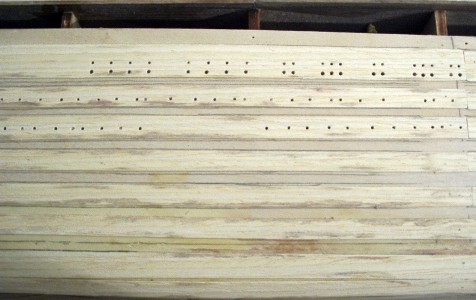 Heute geht es ans Bohren! Die Löcher für die Bullaugen sollen in ihren unterschiedlichen Abmessungen in die Bordwand gemacht werden, erst Seite 1 (alles wird mit Strichliste gezählt), dann geht es an die 2. Seite - klar, die Anzahl stimmt nicht überein! Ich vergleiche noch mal, ob ich auch jedes noch so kleine Loch erwischt habe (2 finde ich noch!), aber es geht einfach nicht auf! Bleibt nur eine richtige Zählliste, und - NATÜRLICH: wieder eine andere Summe!!! Aber mit dieser Liste zähle ich links und rechts, au, Entschuldigung, backbord und steuerbord muss es heißen, und so komme ich auf eine vernünftige Summe. Wie viele sind es wohl? Da spiele ich doch gleich mal Günter Jauch: